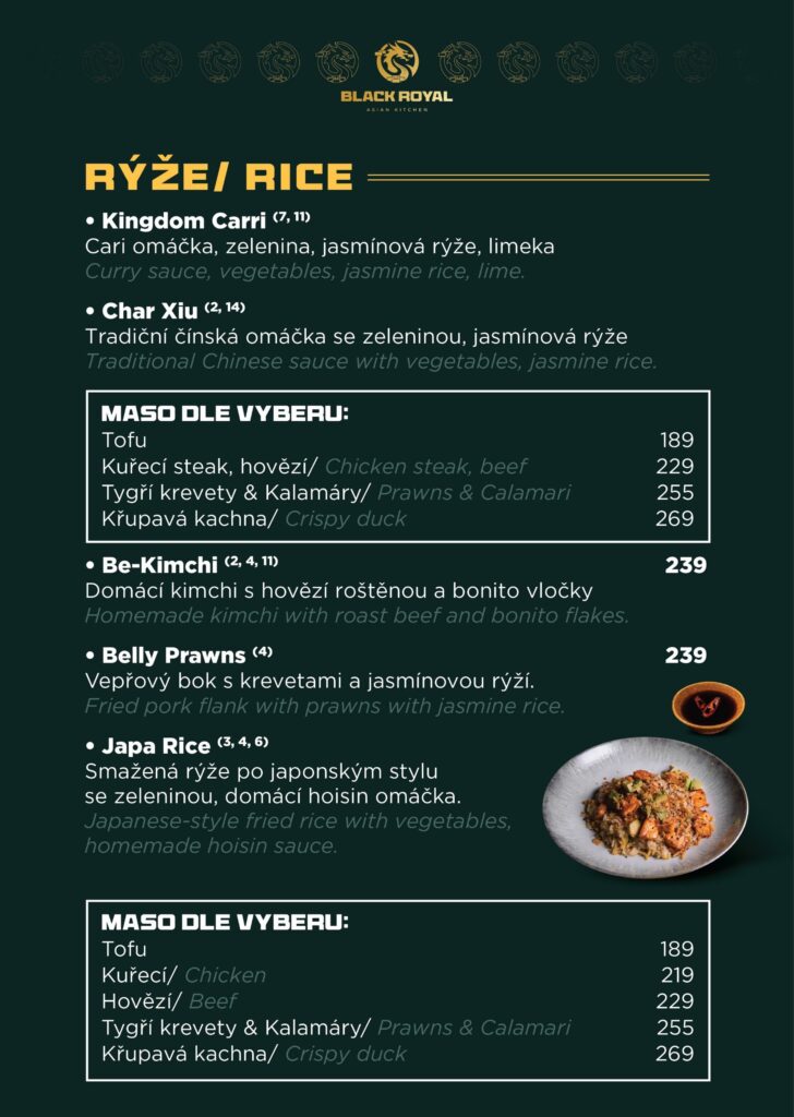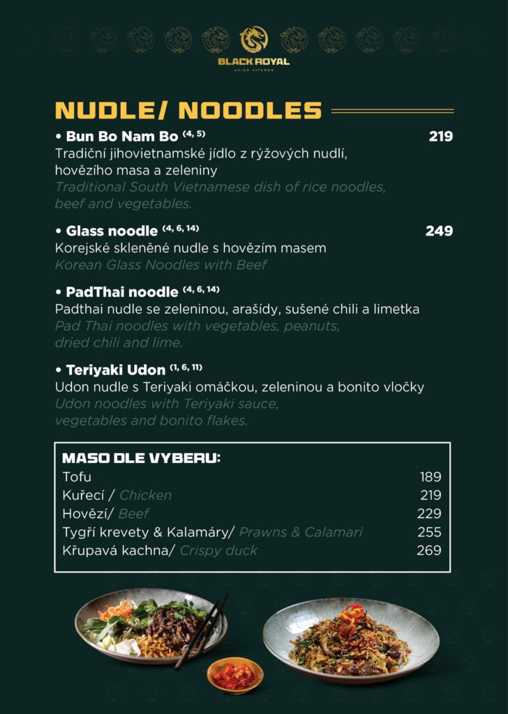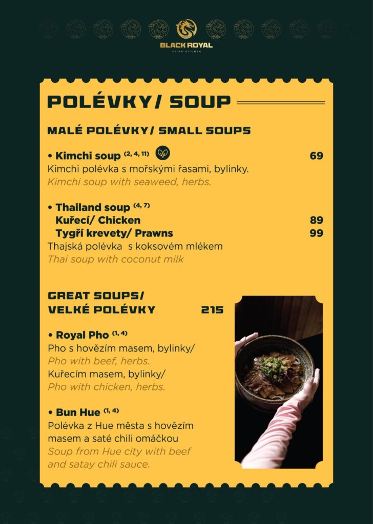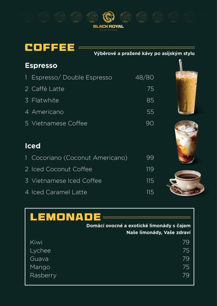 Tři sourozenci Tomáš, Lucie a Honza, absolventi gastronomické školy, po dlouhé době cestování po různých asijských zemích založili Black Royal kitchen, aby vám nabídli svou poctivou asijskou kuchyni plnou čerstvé zeleniny a zdravých surovin.s menu zahrnujícím výborné polévky, závitky, rýže, nudle a vlastní vietnamské kávy. Budou moc rádi, když je navštívíte sami se přesvědčíte, že asijské jídlo muže chutnat jinak, než jej znáte z všudypřítomných bister.